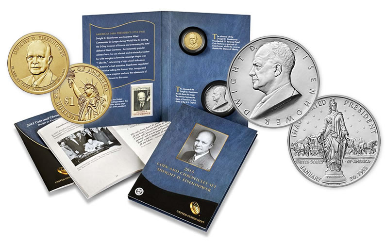 Loading... Please wait...The 2015 Coin and Chronicles Set includes a 2015 Dwight D. Eisenhower $1 Reverse Proof Coin minted in Philadelphia, a Eisenhower Presidential Silver Medal, a 1969 U.S. six cent Dwight D. Eisenhower postage stamp and an informative booklet covering some history from Eisenhower's early years through his presidency. These items were displayed in a rich, deep blue folder covered in a soft touch material with a handsome, textured look that is very gift worthy.