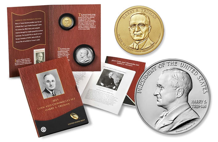 Loading... Please wait...The 2015 Coin and Chronicles Set includes a 2015 Harry S. Truman $1 Reverse Proof Coin minted in Philadelphia (found only in this set!), a Truman Presidential Silver Medal, a 1973 U.S. eight–cent Harry S. Truman postage stamp and an informative booklet covering some history from Truman’s early years through his presidency.