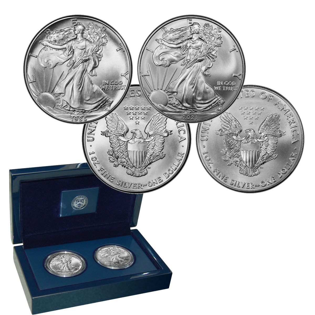 Loading... Please wait...This set includes the First (1986) & Last (2021) ASE dollars in a beautiful U.S. Mint display box
